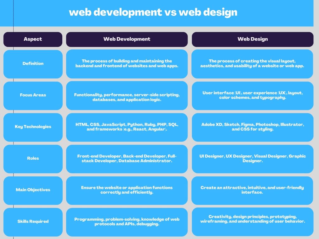 Web Design vs Web Development are often used interchangeably, but they represent distinct yet complementary fields. Web development professionals specialize in the functionality and structure of websites through coding languages. They serve as architects, building the foundation and ensuring seamless technical operation. In contrast, web designers concentrate on a website’s visual appeal, covering aesthetics, color schemes, layout, and user interface design. They function as artists, transforming the blueprint provided by developers into a visually captivating website that reflects the brand’s vision. Essentially, Web Developers build the core structure, while web designers enhance its aesthetic appeal. Many aspiring professionals enter these fields through web development bootcamps to gain foundational skills quickly.