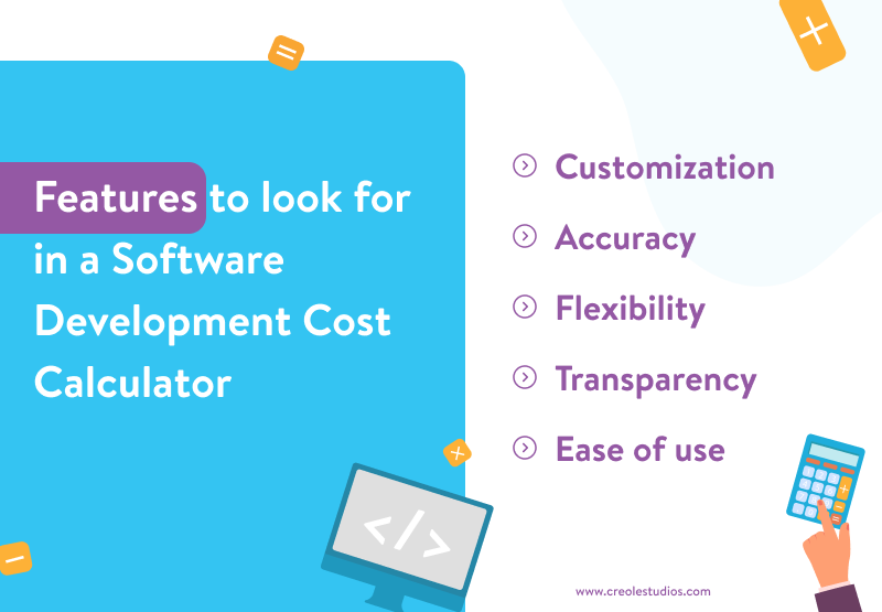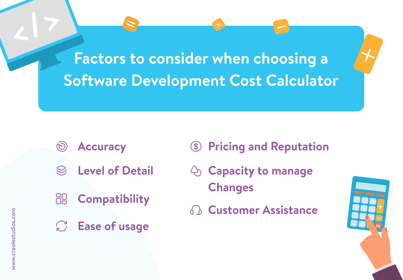 Choosing the right software development cost calculator is crucial for project success. Factors like accuracy, level of detail, compatibility, ease of use, adaptability, and customer support play key roles. Creole Studios offers a flexible and precise calculator with a transparent cost breakdown for reliable estimates.